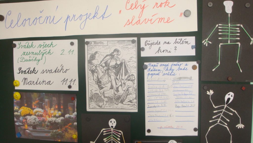 V měsíci říjnu a listopadu jsme si v celoročním projektu připomněli další svátky. Vznik ČSR – kdy jsme zhlédli dokument o tom, jak to vlastně bylo a z něj jsme vycházeli pro další tvorbu. Zkoušeli jsme vymyslet vlastní znaky a vlajky, počítali slovní úlohy na toto zajímavé téma, hodilo se nám i do anglického jazyka v tématu „Where are you from?“ V listopadu jsme skloubili školní anglický Halloween s českými Dušičkami a tentokrát jsme slovní úlohy vymýšleli ve skupinkách, v češtině jsme s předponami s- a z- doplňovali slova a soutěžili k tématu o zesnulých – z/sbledl strachy, svíce s/zkomírala…. při ručních dovednostech vyrostli na chodbě duchové a ve třídě kostlivci. A nezapomněli jsme ani na svatého Martina a vyrobili mu koně. Přijede na bílém?